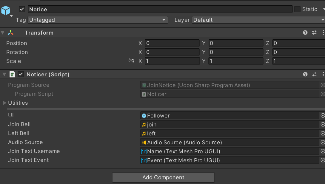Noticerコンポーネントは入退室通知と通知音を制御するコンポーネントです。JoinLogWithScreen または JoinLog プレハブの 子オブジェクトであるNoticeに付加されています。